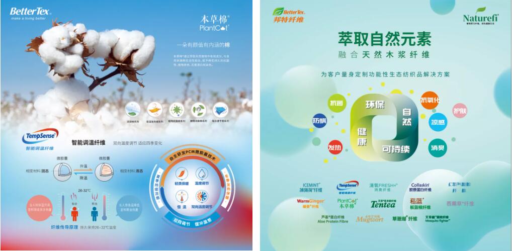 本屆展會(huì),邦特纖維以“Naturefi植物原力纖維取之自然,歸于自然”為主題,向公眾展現(xiàn)綠色生態(tài)的纖維新世界?,F(xiàn)場(chǎng)集中展示包括植物抗菌消臭、植物防螨、蛋白保濕等多種系列復(fù)合功能型高端生態(tài)健康纖維,這些纖維100%可降解,取之自然,歸于自然。此次展出的系列產(chǎn)品在抑菌、舒適、綠色及應(yīng)用等方面各有特色。