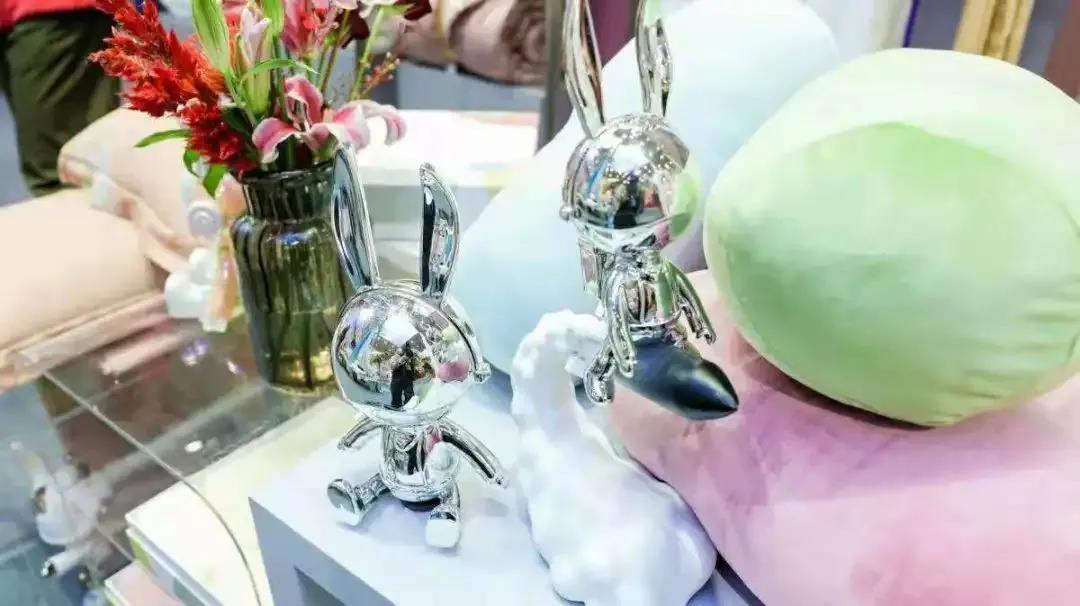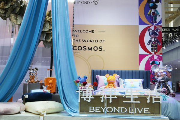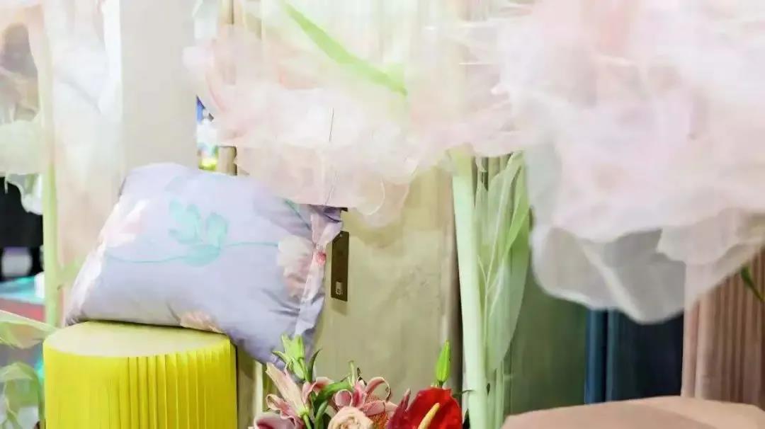 本屆時尚節(jié),展商們加大服飾、家紡品牌的場景運(yùn)用,讓來訪者身臨其境。比如,在博洋的生活展區(qū),臥室的床頭、墻角和梳妝臺上,擺滿了各式各樣星際熊、艾麗詩兔子卡通造型的布偶、抱枕、盲盒和毛絨玩具,走進(jìn)其間,讓人有一種與童話世界相遇的感覺。
