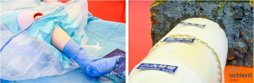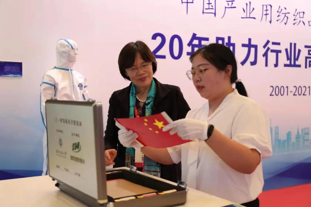 本屆CINTE21特設(shè)創(chuàng)新產(chǎn)品展示區(qū),以“20年助力行業(yè)高質(zhì)量發(fā)展”為主題,以“協(xié)會(huì)成立20年回顧篇”“行業(yè)科技成果篇”“行業(yè)綠色發(fā)展篇”三大篇章,回顧了產(chǎn)業(yè)用紡織品行業(yè)20年的發(fā)展歷程,展現(xiàn)了產(chǎn)業(yè)用紡織品在醫(yī)療衛(wèi)生、環(huán)境保護(hù)、土工建筑、應(yīng)急安防、海洋工程、航空航天和國防軍工等領(lǐng)域的應(yīng)用,展示了非織造產(chǎn)業(yè)的綠色發(fā)展成果。展區(qū)負(fù)責(zé)人詳細(xì)地向到訪人員介紹了陳列的高新技術(shù)產(chǎn)品,包括麻竹纖維車門內(nèi)板、嫦娥五號(hào)任務(wù)月面展示國旗、單兵戰(zhàn)術(shù)款全防護(hù)防彈衣、BW090401型射線防護(hù)服、人造血管等產(chǎn)品。