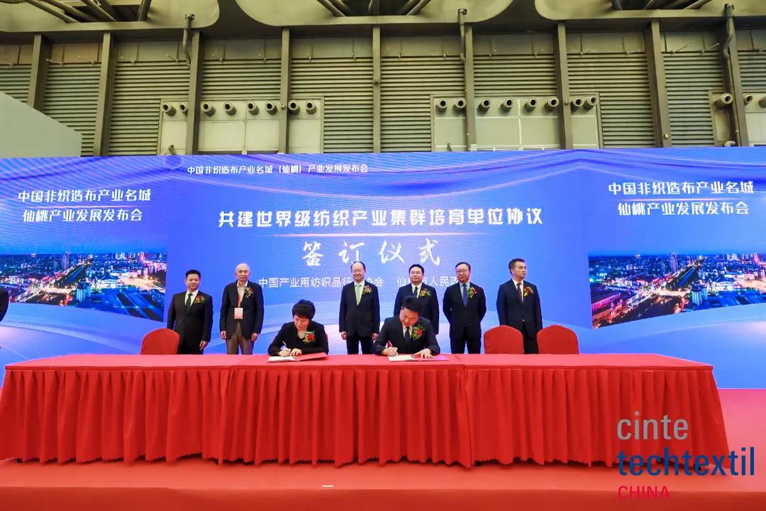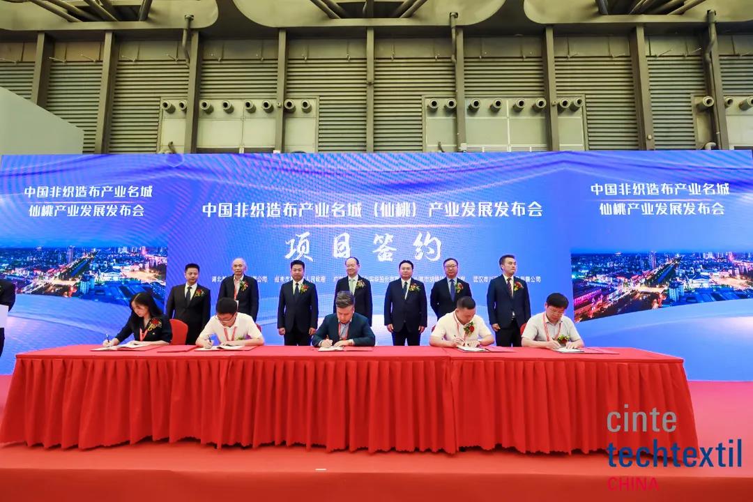發(fā)布會(huì)上舉行了仙桃市彭場鎮(zhèn)人民政府與湖北新鑫無紡布有限公司、廣東茂名石化實(shí)華股份有限公司簽約儀式,仙桃市胡場鎮(zhèn)人民政府與武漢市川田衛(wèi)生用品有限公司簽約儀式。李桂梅與仙桃市委常委、統(tǒng)戰(zhàn)部長胡常偉簽訂培育共建“世界級(jí)紡織產(chǎn)業(yè)集群培育單位”協(xié)議書。高勇、孫瑞哲、許坤元、陳偉康、徐迎新見證簽約儀式。