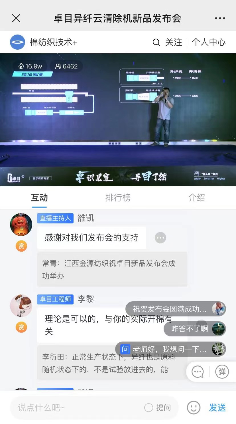 發(fā)布會(huì)現(xiàn)場(chǎng),來(lái)自行業(yè)媒體、企業(yè)用戶、紡織高校學(xué)者分別就新產(chǎn)品的技術(shù)問(wèn)題、異纖機(jī)的性能評(píng)價(jià)等及他們關(guān)心的話題在線下和線上直播間進(jìn)行提問(wèn)。卓目異纖機(jī)曾霖博士現(xiàn)場(chǎng)回答了媒體和企業(yè)關(guān)心的問(wèn)題:分別就異纖機(jī)在產(chǎn)品研發(fā)、產(chǎn)品優(yōu)勢(shì)、合作伙伴優(yōu)勢(shì)、市場(chǎng)應(yīng)用,人工智能加持下對(duì)紡織行業(yè)帶來(lái)的意義,以及產(chǎn)品未來(lái)規(guī)劃發(fā)展方面的問(wèn)題分享了團(tuán)隊(duì)的觀點(diǎn)。曾霖博士介紹:16年來(lái)卓目異纖機(jī)圍繞用戶需求,結(jié)合武漢大學(xué)優(yōu)勢(shì)的圖像識(shí)別處理技術(shù),不斷優(yōu)化產(chǎn)品設(shè)計(jì),這次看似簡(jiǎn)單的幾點(diǎn)改進(jìn),凝聚了卓目人十多年的積累,幅寬、產(chǎn)量的提升是異纖機(jī)檢測(cè)設(shè)計(jì)史上值得炫耀和肯定的,也希望用戶通過(guò)發(fā)布會(huì),了解更多異纖檢測(cè)知識(shí),了解異纖檢測(cè)裝備的評(píng)價(jià)標(biāo)準(zhǔn),為紡織紗線質(zhì)量提升賦能。