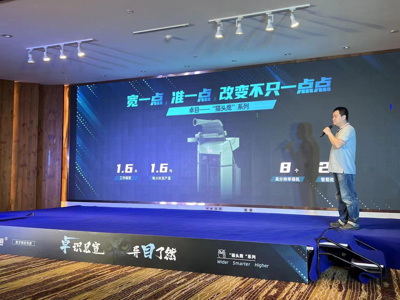 武漢紡織大學(xué)易長(zhǎng)海教授在新產(chǎn)品發(fā)布講解后,作了點(diǎn)評(píng),他說(shuō):“貓頭鷹”系列和傳統(tǒng)異纖機(jī)相比有三個(gè)提升,產(chǎn)能效率大大提升、準(zhǔn)確性精準(zhǔn)度提升、安全保障性提升。對(duì)于寬幅的創(chuàng)新,在國(guó)內(nèi)外的設(shè)備中還沒(méi)有看到。卓目團(tuán)隊(duì)是一個(gè)學(xué)習(xí)技術(shù)型的研發(fā)團(tuán)隊(duì),他們用跨學(xué)科的知識(shí),為紡織行業(yè)注入活力,創(chuàng)造成果。希望未來(lái)中國(guó)的紡織能在世界上成為強(qiáng)紡織。
