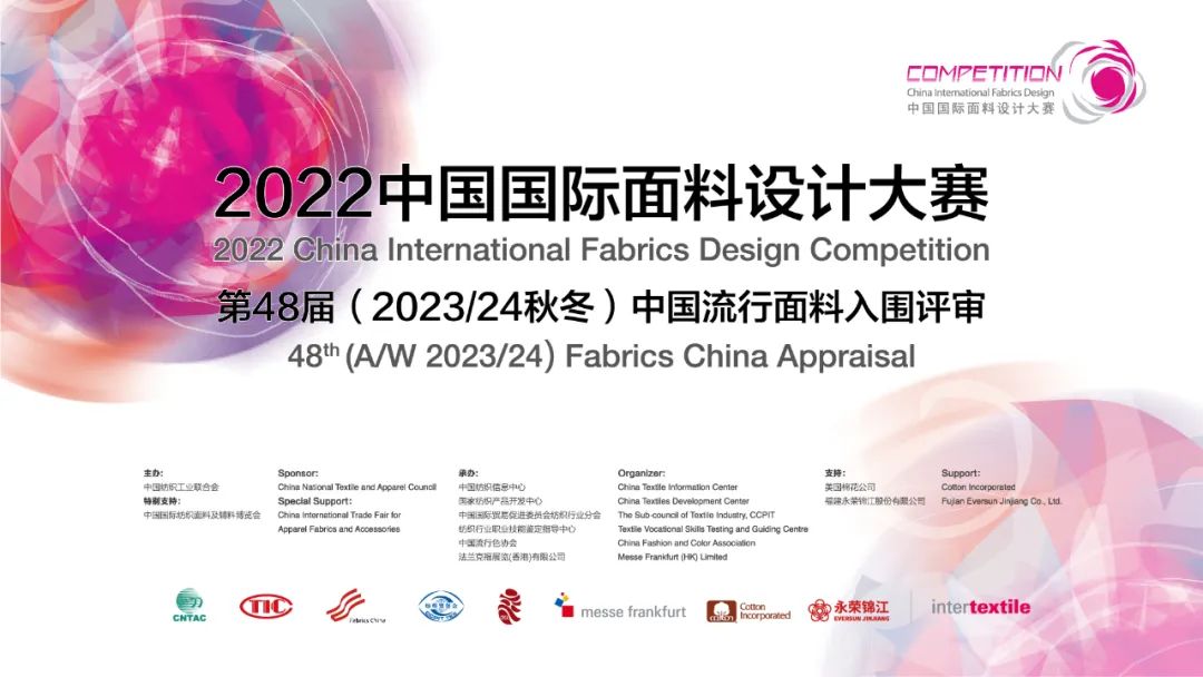 中國國際面料設(shè)計大賽活動由中國紡織工業(yè)聯(lián)合會主辦,中國紡織信息中心、國家紡織產(chǎn)品開發(fā)中心、中國國際貿(mào)易促進(jìn)委員會紡織行業(yè)分會、紡織行業(yè)職業(yè)技能鑒定指導(dǎo)中心、中國流行色協(xié)會、法蘭克福展覽(香港)有限公司等單位共同承辦,是中國紡織面料設(shè)計領(lǐng)域最具權(quán)威性和影響力的專業(yè)賽事。
