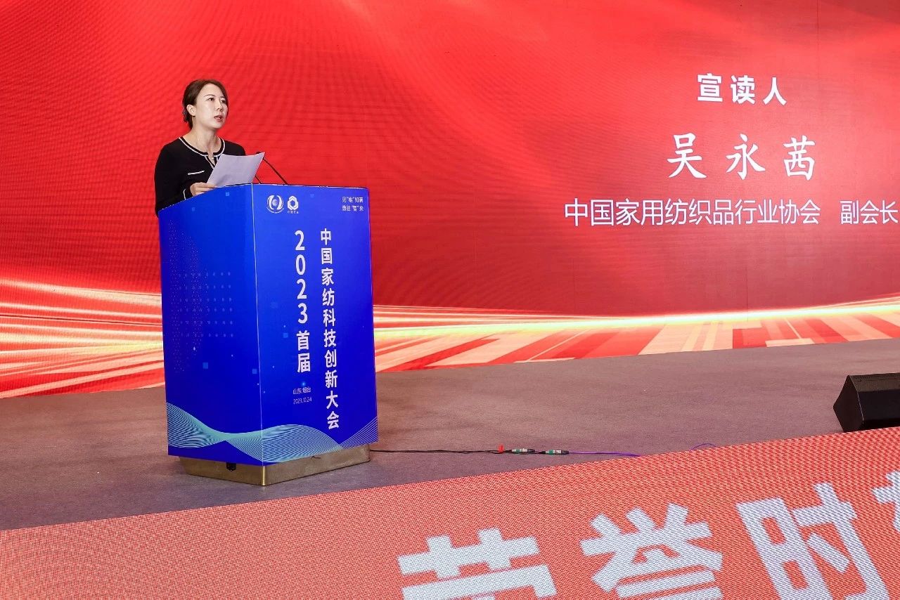 中國(guó)家用紡織品行業(yè)協(xié)會(huì)副會(huì)長(zhǎng)吳永茜宣讀《關(guān)于2023年“科技+家紡”優(yōu)秀論文(案例)及2023年中國(guó)家紡行業(yè)優(yōu)秀專(zhuān)利評(píng)選的決定》《關(guān)于成立中國(guó)家用紡織品行業(yè)協(xié)會(huì)智庫(kù)專(zhuān)家團(tuán)隊(duì)的通知》。