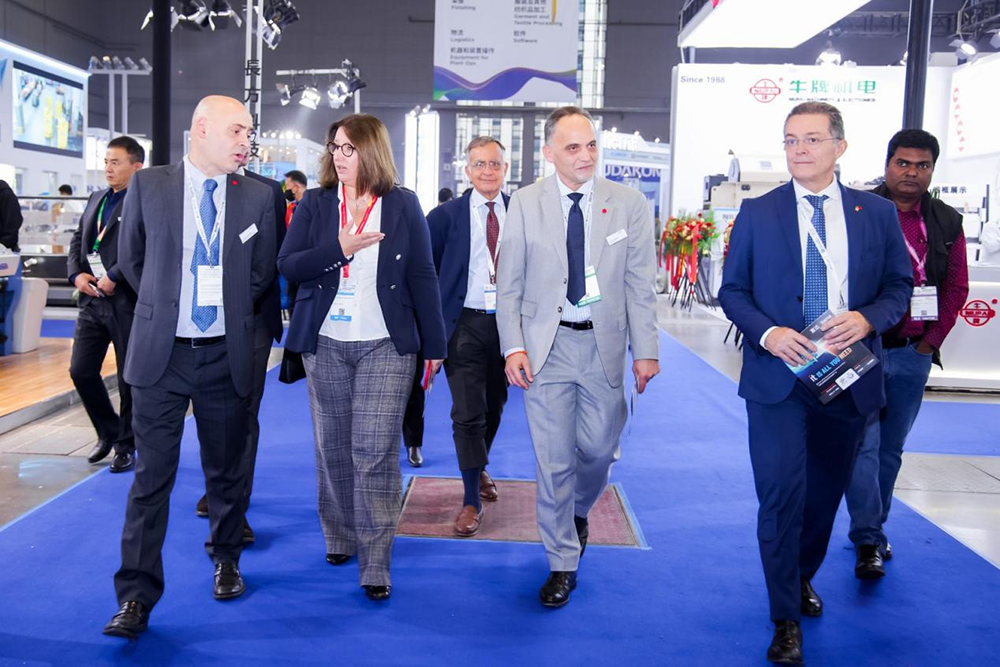 意大利駐上海總領(lǐng)事安緹雅(Tiziana D’Angelo)一行前往展覽場(chǎng)地,與意大利國家展團(tuán)以及其他意大利參展企業(yè)進(jìn)行了深入交流。她鼓勵(lì)參展意大利企業(yè)進(jìn)一步拓展行業(yè)技術(shù)交流,加強(qiáng)創(chuàng)意創(chuàng)新合作,讓更多亞洲及中國客戶了解到意大利領(lǐng)先的紡織工業(yè)技術(shù)與解決方案。