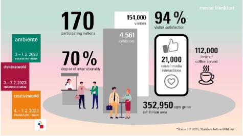 2023年2月3/4至7日,法蘭克福展覽集團(tuán)旗下三大領(lǐng)先消費(fèi)品展——法蘭克福國際春季消費(fèi)品展覽會(Ambiente)、法蘭克福國際圣誕禮品世界展覽會(Christmasworld)以及法蘭克福DIY手工制作及創(chuàng)意文具展(Creativeworld)首次同期在法蘭克福展覽中心舉辦,引領(lǐng)全球生活方式新趨勢。在為期5天的展覽期間,展會聚焦了生活方式間的融合,重點關(guān)注可持續(xù)發(fā)展相關(guān)議題。本屆展會共吸引了4,561家參展企業(yè)及154,000名專業(yè)買家參與其中,總展覽面積高達(dá)352,950平方米,覆蓋了法蘭克福展覽中心全部展館。據(jù)主辦方統(tǒng)計,共有來自逾170個國家的與會者蒞臨展會現(xiàn)場,共襄盛世。
