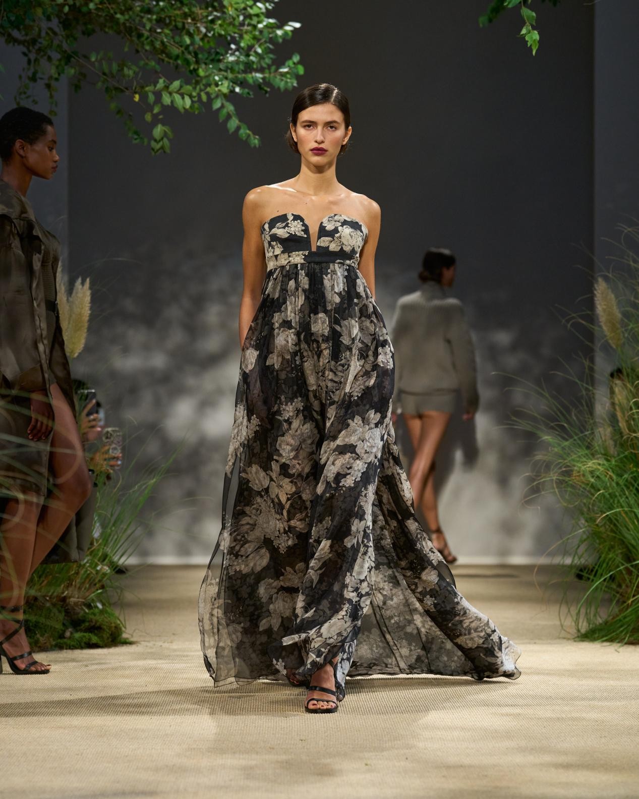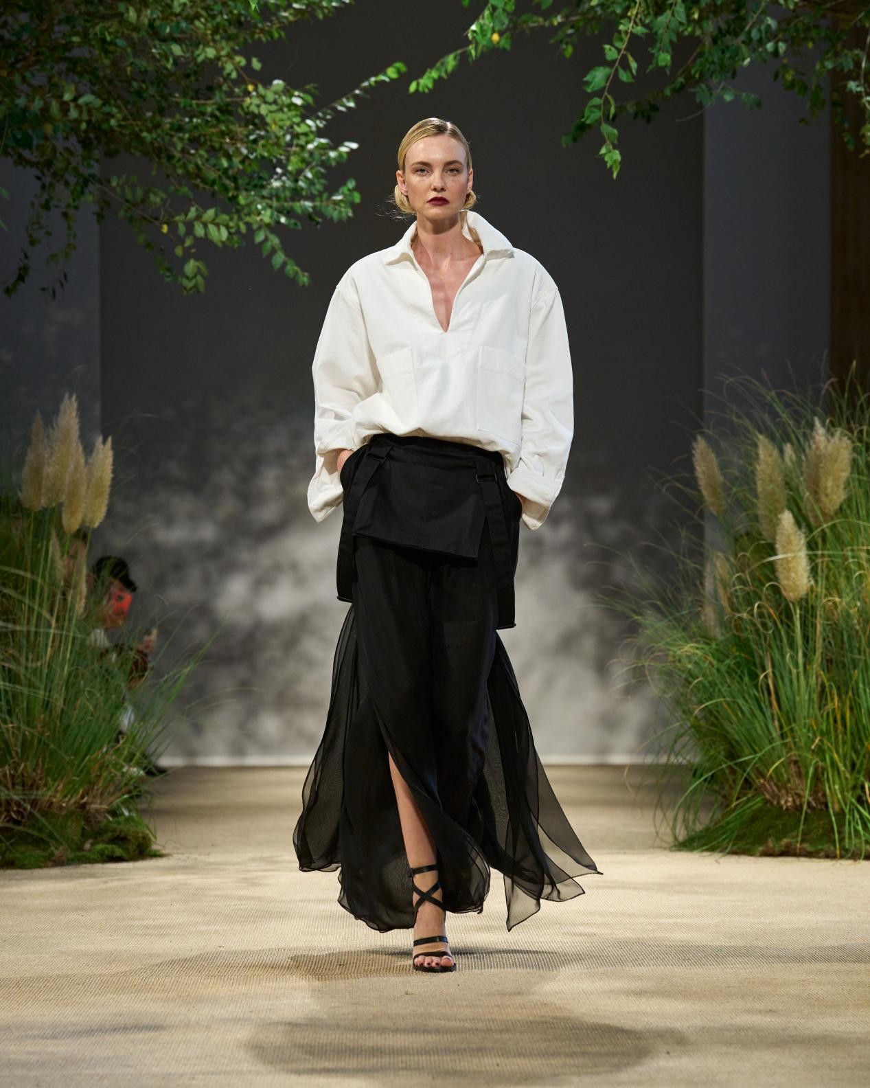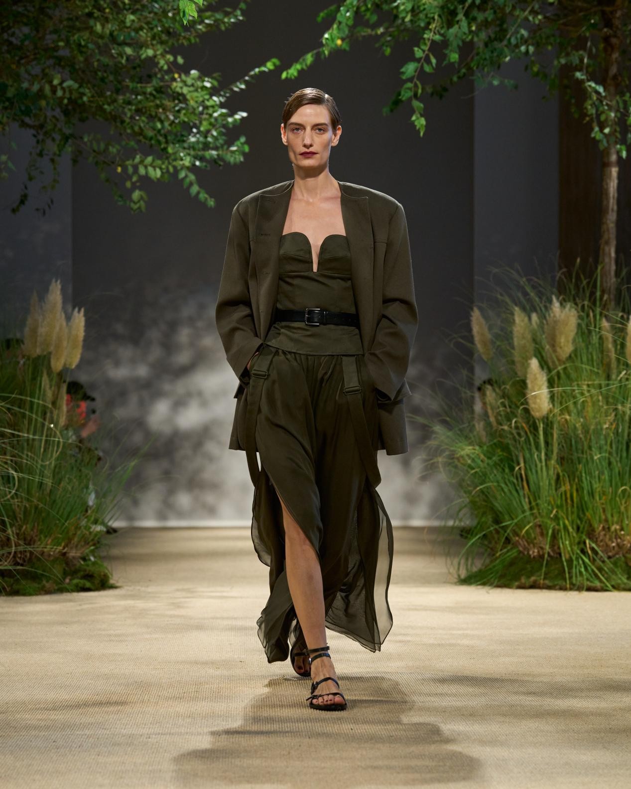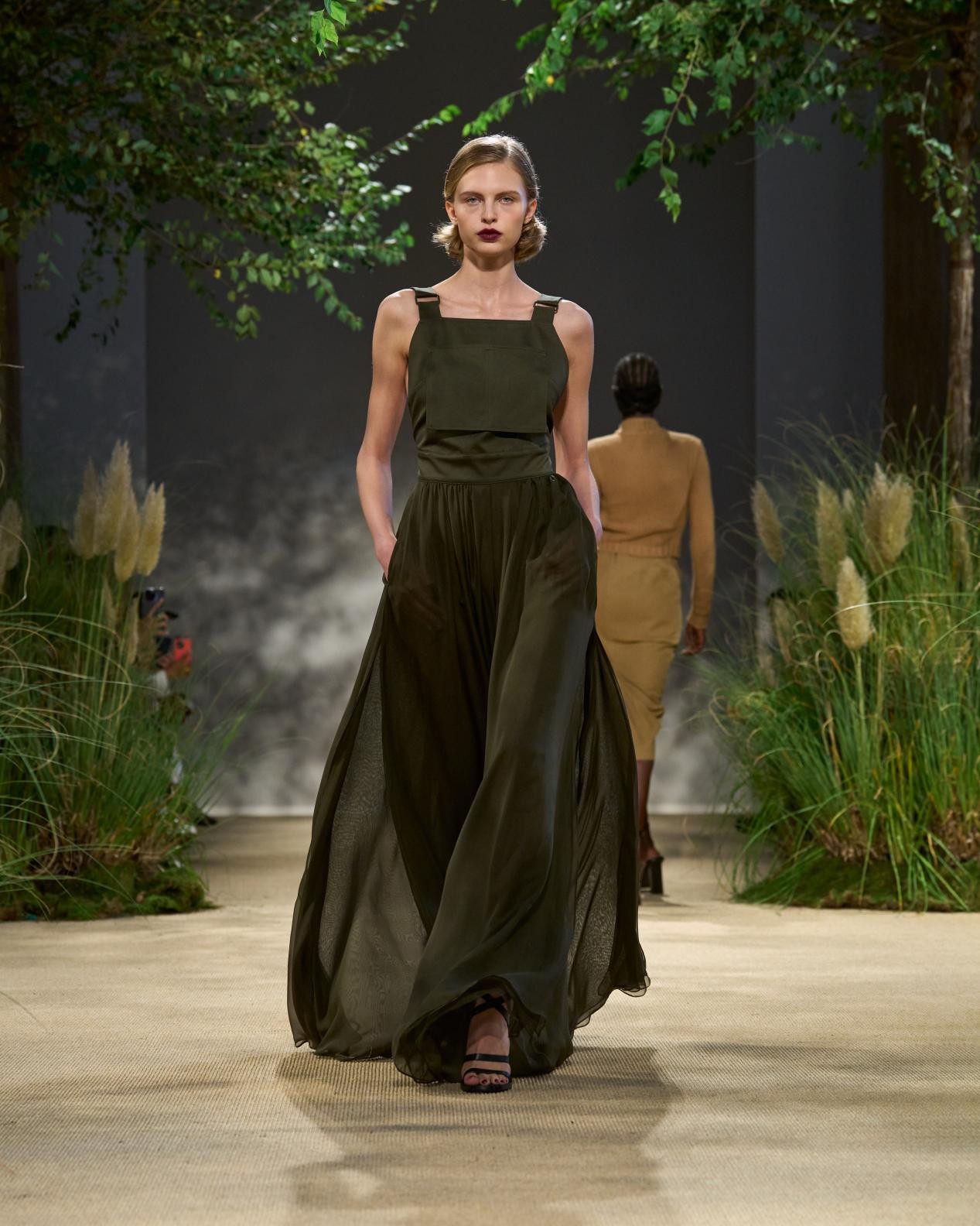 露背吊帶裙以園丁圍裙為靈感,三層雪紡禮裙配以華達(dá)呢肩帶,展現(xiàn)硬朗的時髦風(fēng)范,晝夜皆宜穿著。