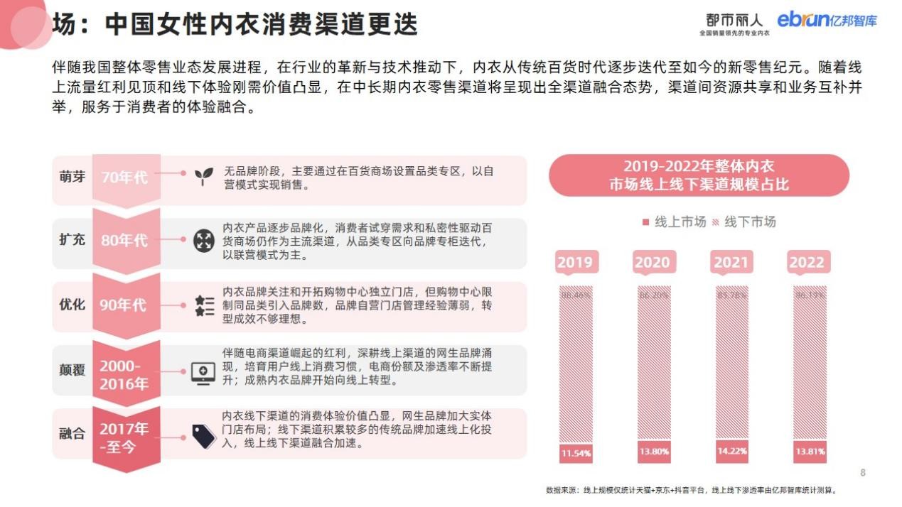 立足于行業(yè)發(fā)展、消費(fèi)趨勢(shì)、發(fā)展趨勢(shì)研究洞察,億邦智庫(kù)聯(lián)合都市麗人發(fā)布《2023女性內(nèi)衣行業(yè)消費(fèi)趨勢(shì)研究報(bào)告》,從發(fā)展沿革、消費(fèi)者洞察、機(jī)會(huì)研判、未來展望4大維度解讀行業(yè)風(fēng)向及機(jī)會(huì),希望為行業(yè)提供參考及啟發(fā)。