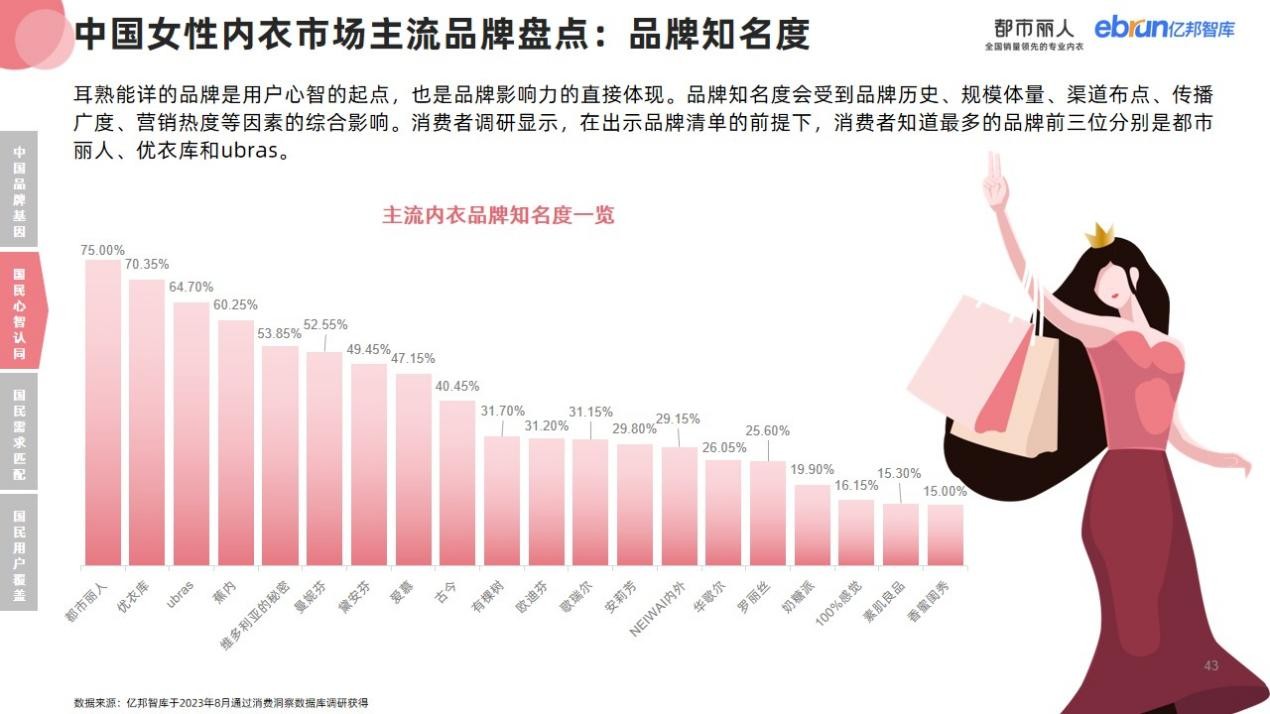 從國(guó)民心智認(rèn)同維度,在出示品牌清單的前提下,在消費(fèi)者中知名度排名前三的品牌分別是都市麗人、優(yōu)衣庫(kù)和ubras。消費(fèi)者感知到的品牌形象標(biāo)簽與品牌方主動(dòng)輸出的定位/理念/價(jià)值導(dǎo)向吻合度越高,越有利于品牌獲得用戶認(rèn)同、占領(lǐng)用戶心智。