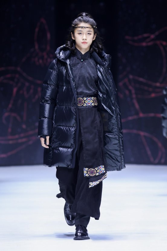 巴圖、博谷則身穿“藏地黑金”將高梵與92歲唐卡大師嘎瑪?shù)吕章?lián)名款展示給觀眾。“藏地黑金系列”選用了唐卡中的兩個(gè)圖騰,如意寶和智慧之劍。門襟處設(shè)計(jì)如意寶,代表著力量和智慧,象征著平安吉祥,如意寶上面的寶珠,傳說能治百病,同時(shí)有健康的寓意。這是大師在知曉圖案是給小孩穿的,就選出了最有代表性的圖騰,而在帽子上將高梵的LOGO和唐卡中的智慧之劍進(jìn)行結(jié)合。