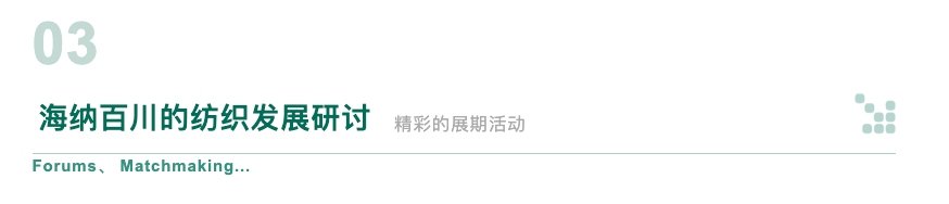 “海納百川的紡織發(fā)展研討”區(qū)域,則是一個(gè)開(kāi)放包容、思想碰撞的平臺(tái)。這里將舉辦多場(chǎng)高端論壇與圓桌對(duì)話,特邀行業(yè)領(lǐng)袖、學(xué)者專家及企業(yè)精英,就紡織產(chǎn)業(yè)的全球趨勢(shì)、可持續(xù)發(fā)展策略、品牌建設(shè)與市場(chǎng)拓展等議題進(jìn)行深入探討。通過(guò)分享成功經(jīng)驗(yàn)、分析市場(chǎng)趨勢(shì)、預(yù)測(cè)未來(lái)走向,共同為紡織產(chǎn)業(yè)的繁榮發(fā)展貢獻(xiàn)智慧與力量。如同期將舉辦2024中國(guó)紡織新材料論壇、2024RCEP國(guó)際紡織產(chǎn)業(yè)峰會(huì)(紹興)、2024RCEP系列活動(dòng)-“新融合”亞洲品牌服飾趨勢(shì)交流會(huì)、2024RCEP系列活動(dòng)-“新突破”紡織品開(kāi)發(fā)者大會(huì)、品牌專場(chǎng)自由對(duì)接會(huì)、2024新青年文化服飾論壇暨上下游產(chǎn)業(yè)對(duì)接活動(dòng)等。