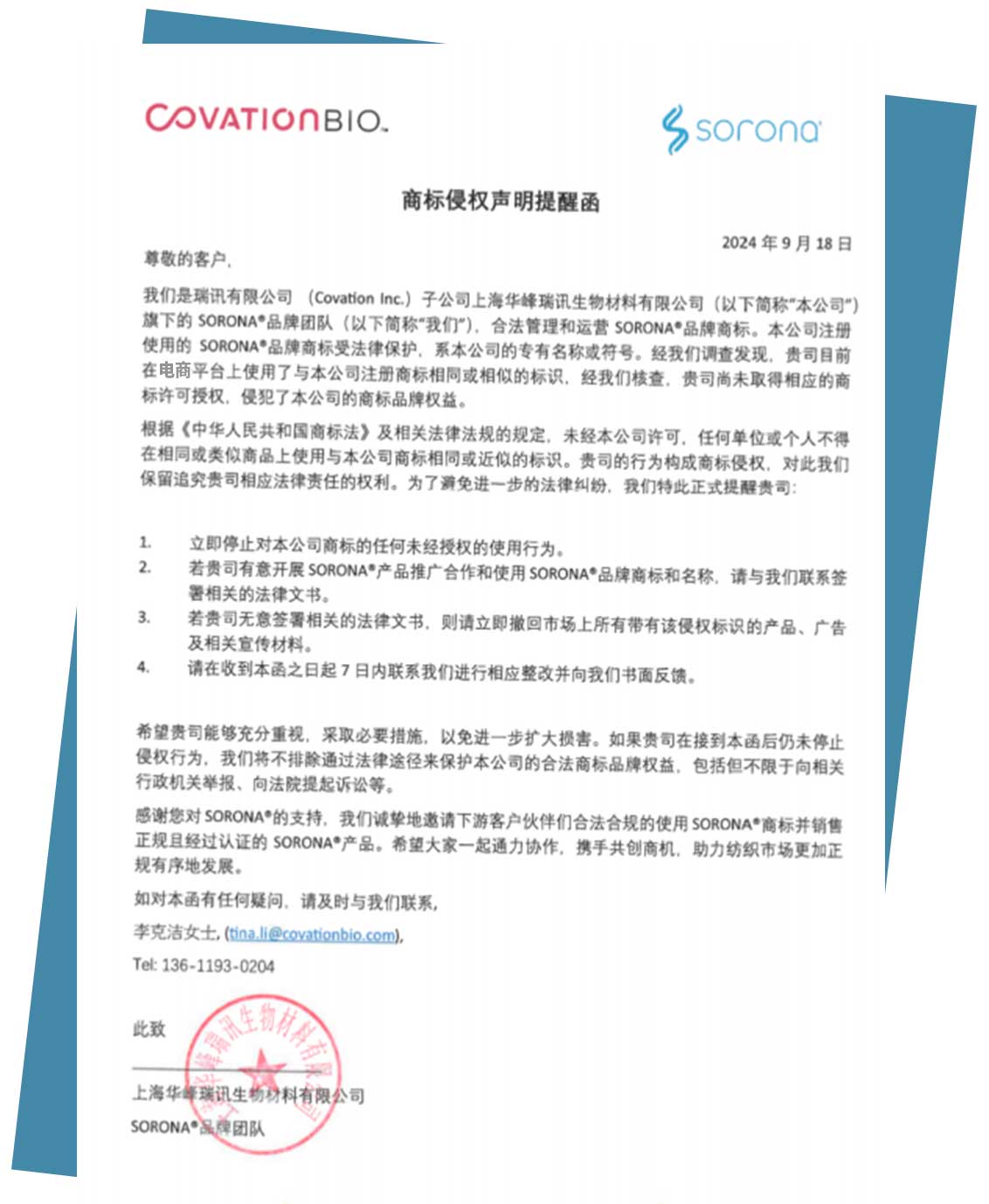 如果您想向我們申請使用SORONA®商標(biāo),需要簽署一份“商標(biāo)使用許可協(xié)議” 由此成為SORONA®商標(biāo)的使用許可人,進(jìn)而可以在產(chǎn)品包裝、標(biāo)簽、廣告等宣傳方式和宣傳物料中使用SORONA®品牌標(biāo)示圖(logo),凸顯SORONA®的品牌形象。需要注意的是,凡是使用了SORONA®商標(biāo)的商品及宣傳物料,須提交SORONA®營銷傳播部門進(jìn)行審批通過后,方可上市。上市后如需對商品及宣傳物料作任何改變,須重新提交SORONA®營銷傳播部門審批。如需申請成為SORONA®品牌許可人,敬請聯(lián)系:Tina.li@covationbio.com