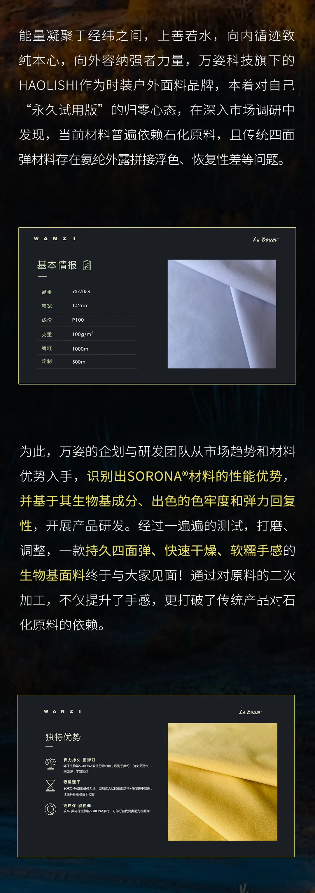 SORONA®是一項(xiàng)突破性的新型生物基聚合物解決方案,其核心原料來自每年可重復(fù)生長的植物。SORONA®不僅具有符合潮流趨勢的可持續(xù)發(fā)展和環(huán)保主題,而且可以為纖維帶來多種功能的優(yōu)良特性。用SORONA®原料制成的纖維的“多功能性”為面料和服裝設(shè)計(jì)師提供了更大范圍的設(shè)計(jì)自由!