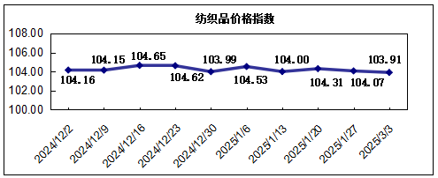 “中國·柯橋紡織指數” 20250303期紡織品價格指數收報于103.91點,環(huán)比下跌0.15%,較年初下跌0.59%,同比下跌1.58%。
