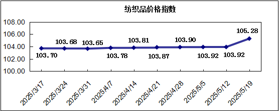 “中國·柯橋紡織指數(shù)” 20250519期紡織品價格指數(shù)收報于105.28點,環(huán)比上漲1.31%,較年初上漲0.71%,去年同比上漲0.04%。