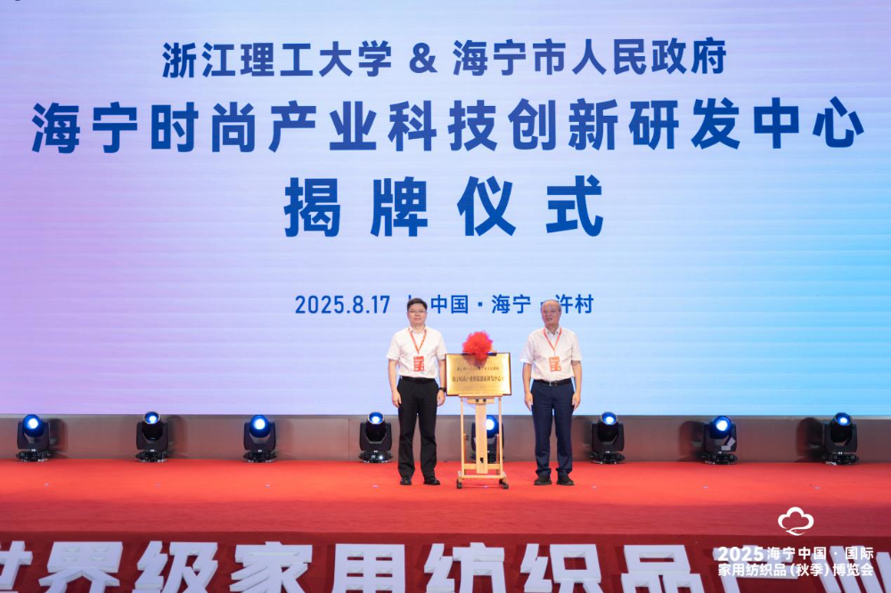 活動(dòng)現(xiàn)場(chǎng),浙江理工大學(xué)校長陳文興、中共海寧市委書記徐明良共同為“浙江理工大學(xué)&海寧市人民政府 海寧時(shí)尚產(chǎn)業(yè)科技創(chuàng)新研發(fā)中心(籌)”揭牌。