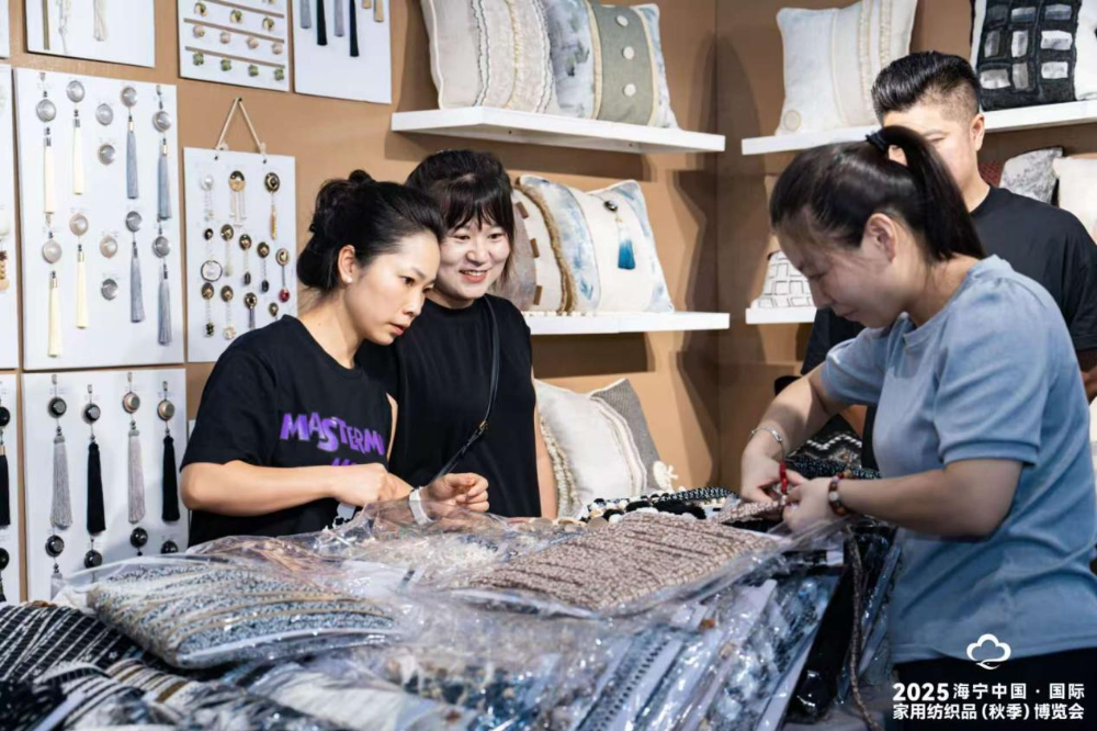 展館內(nèi)人潮如織,隨處可見形色匆匆找樣的身影;各大展位人聲鼎沸,隨處可聞高談闊論洽談的聲音。在家紡布藝展區(qū),2000余家源頭展商,各自展出了窗簾、沙發(fā)、墻布、床上用品、家居軟裝等全品類產(chǎn)品;“非遺東方 錦韻潮城”紡織非遺創(chuàng)意時(shí)尚展重點(diǎn)展示了紡織(非遺)文創(chuàng)產(chǎn)品、非遺服飾及面料,許多觀眾駐足于此,深入了解非遺文化的獨(dú)特魅力;“許村優(yōu)品”家紡?fù)赓Q(mào)展,以品牌出海與精準(zhǔn)鏈接為切入點(diǎn),聚集高品質(zhì)家紡?fù)赓Q(mào)貨源,成為各國外商集聚的打卡地……各大展區(qū)交相輝映,蛇形簾、智能家紡、功能性產(chǎn)品等新產(chǎn)品、新工藝、新技術(shù)層出不窮,一展海寧家紡創(chuàng)新實(shí)力。
