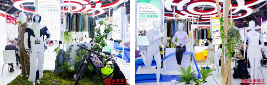 從纖維端切入功能,從面料端轉(zhuǎn)換成衣,整個展位如同一場“可觸摸的潮流發(fā)布會”,使觀眾通過場景陳設直觀感受每一種新材料在成衣中的應用效果。