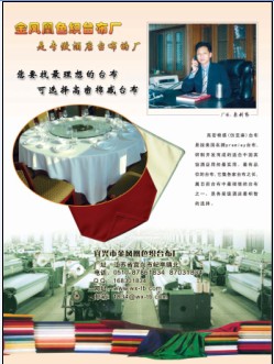 我廠是從織布到成品縫制一條龍的全能型臺(tái)布專業(yè)生產(chǎn)廠,具有生產(chǎn)各類臺(tái)布的多功能設(shè)備,有超寬幅(360cm-380cm)劍桿機(jī),可生產(chǎn)各類超寬幅臺(tái)布和裝飾布,及各類服裝面料等,如色織床單布,沙發(fā)布,全棉寬幅布等,VISA(維莎)臺(tái)布;仿亞麻臺(tái)布;棉感臺(tái)布是我廠的推薦產(chǎn)品,格子臺(tái)布;高支高密緞紋臺(tái)布和大提花臺(tái)布是我廠的常備產(chǎn)品,歡迎來廠考察指導(dǎo)。 我廠專業(yè)生產(chǎn)臺(tái)布、臺(tái)裙、椅子套等酒店大堂紡織。我的電話是零伍壹零 捌柒捌陸壹捌叁肆