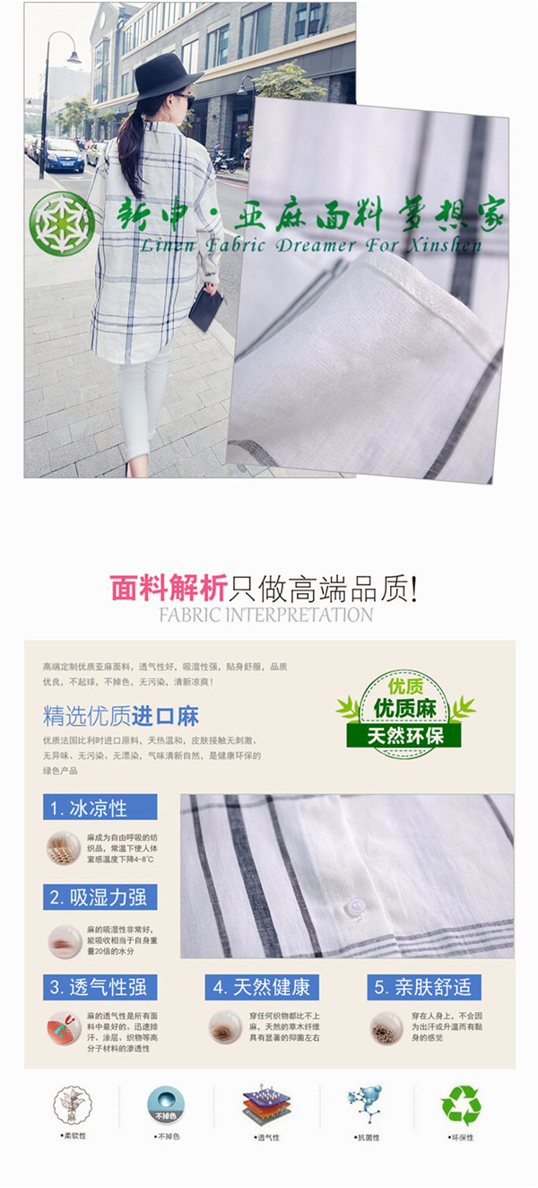優(yōu)質(zhì)純亞麻寬松落肩休閑格子女襯衫面料