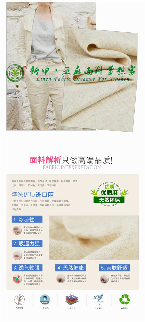 關(guān)鍵字:亞麻面料,優(yōu)質(zhì)舒適,涼爽親膚,寬松休閑,簡約大方