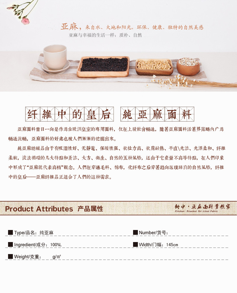 關(guān)鍵字:亞麻面料,高檔時(shí)尚,自然環(huán)保,防塵抑菌,不易沾灰