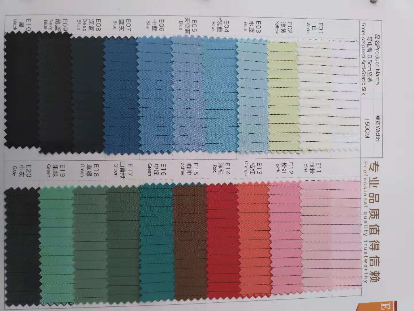 產(chǎn)品有防靜電系列,防輻射系列,阻燃系列,防酸堿系列,防油拒水系列,防紫外線系列等。同時還可以提供涂層,復(fù)合,軋光軋字,植絨等后處理工藝。產(chǎn)品深受國內(nèi)外廣大用戶的歡迎,所生產(chǎn)的功能性織物經(jīng)國家勞動保護(hù)用品監(jiān)督檢驗中心,SGS等權(quán)威部門檢測,其性能符合國內(nèi),國際標(biāo)準(zhǔn)。