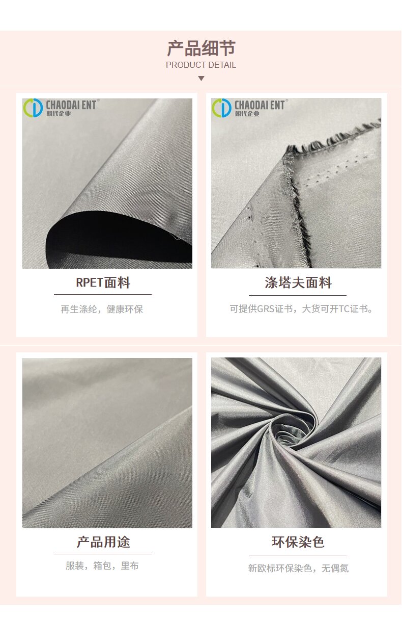 關(guān)鍵字:再生滌塔夫面料,滌塔夫面料,箱包面料,服裝面料