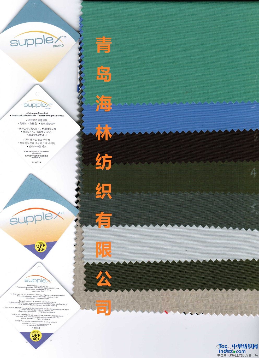 SUPPLEXâ是英威達(dá)(杜邦)公司研制開發(fā)的一種尼龍66空氣變形絲,此空變絲經(jīng)過特殊工藝能達(dá)到抗紫外線指數(shù)40+(UPF 40+),具有很好的戶外防護(hù)紫外線作用,我公司采用此原料做成的面料,經(jīng)過日本進(jìn)口噴氣織機(jī)織造,環(huán)保染色后,手感細(xì)膩、柔軟、飽滿,色澤艷麗,摸起來像棉織物,既適合制作貼身衣物,又適合制作戶外防護(hù)用的外衣、遮陽帽等,其透氣性、舒適性與棉織物相當(dāng);其次SUPPLEXâ纖維為超細(xì)、多孔結(jié)構(gòu),具有虹吸功能,達(dá)到排汗速干的功能;由于SUPPLEXâ面料本身為尼龍,因此結(jié)實(shí)耐磨。此外,SUPPLEXâ面料還具有防風(fēng)、抗水、重量輕、易打理的特點(diǎn)。所以說海林紡織生產(chǎn)的SUPPLEX®面料是一種非常適合戶內(nèi)外運(yùn)動的好面料。
