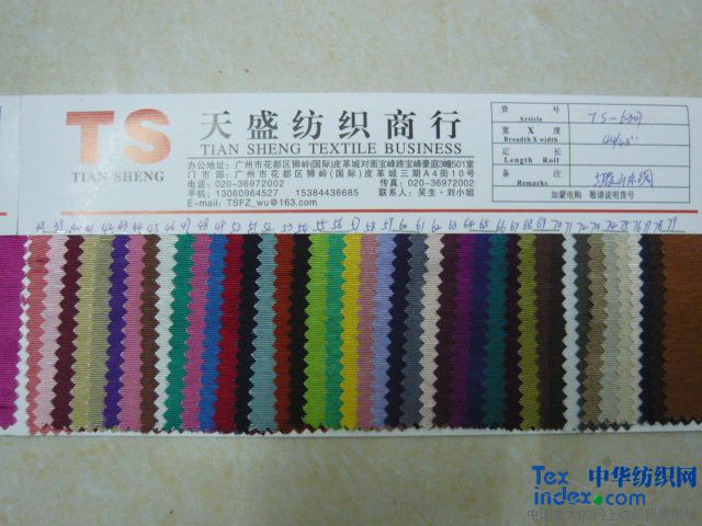 天盛紡織公司是一家專門從事優(yōu)質(zhì)高檔箱包、服裝類、鞋類面料和里料的貿(mào)易公司,公司地址位于廣東省廣州市花都區(qū)獅嶺國際皮具城,我公司與廣州地區(qū)的布廠及染廠有著多年的合作關(guān)系,所經(jīng)營的產(chǎn)品可通過所有歐美標(biāo)準(zhǔn)。