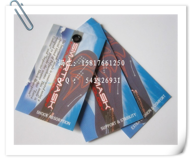 吊牌:吊牌(Tag 或Tagcard)的制作,按介質分有紙制的、塑料的、金屬的;按形狀結構分有長方形、對折形、圓形、三角形、插袋式以及其它特殊造型的;按功能分有普通型、條碼防偽型和全息防偽型等等