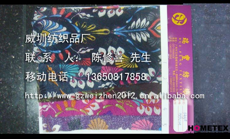陽江巿江城區(qū)威圳紡織品廠是紡織品、日用品、服裝及輔料等產(chǎn)品專業(yè)生產(chǎn)加工的公司,擁有完整、科學(xué)的質(zhì)量管理體系。陽江巿江城區(qū)威圳紡織品廠的誠信、實(shí)力和產(chǎn)品質(zhì)量獲得業(yè)界的認(rèn)可。以上產(chǎn)品全部現(xiàn)貨供應(yīng),可隨時(shí)提供樣布卡和現(xiàn)貨,隨時(shí)發(fā)貨。所有產(chǎn)品全部是廠家直銷價(jià),我們承諾:以超低利潤營銷,我們只求銷售量。為保證您的利益,我司建議您在采購前先確認(rèn)我們的品質(zhì)樣與顏色樣后再拿大貨,期待與您的真誠合作。因產(chǎn)品種類較多,具體參考未盡詳盡,如有需要,請(qǐng)您與我們聯(lián)系。