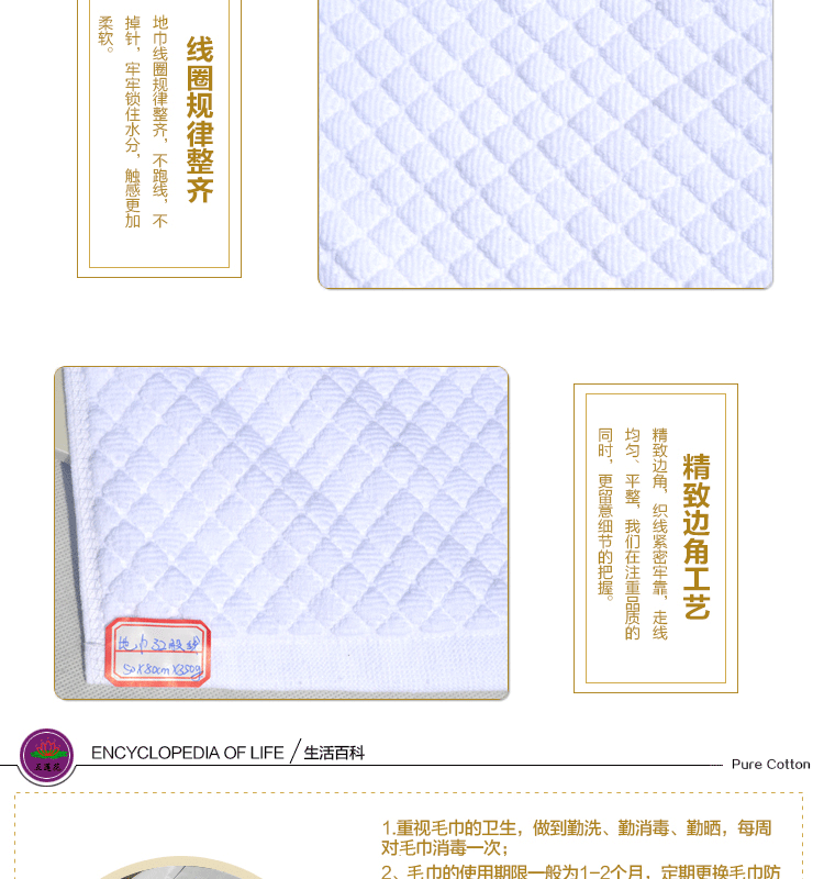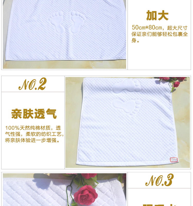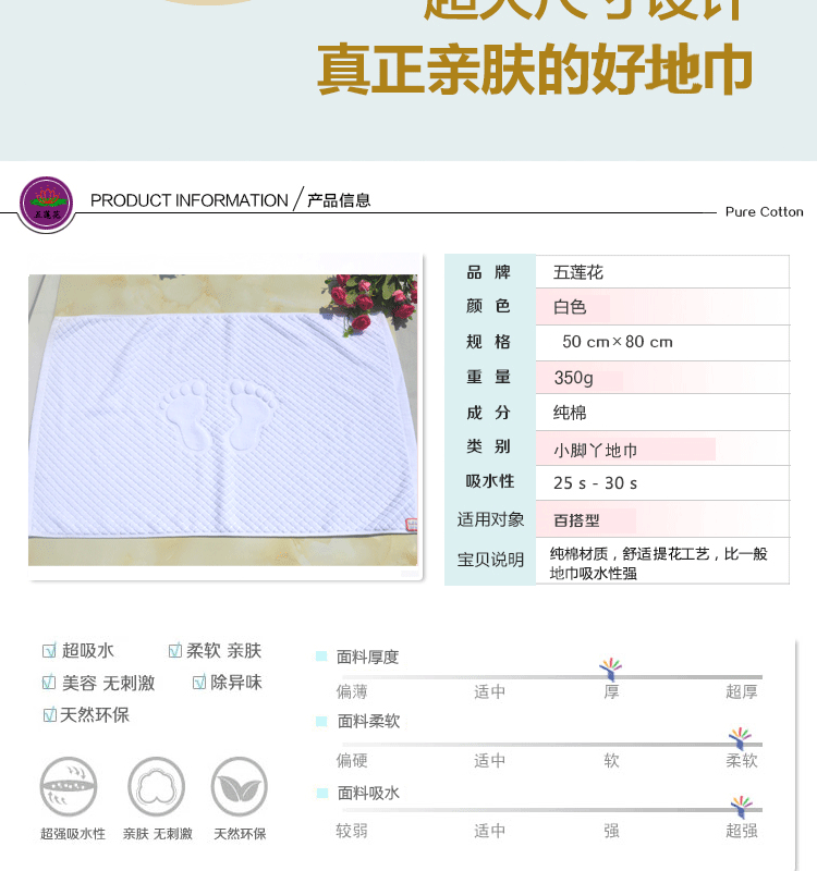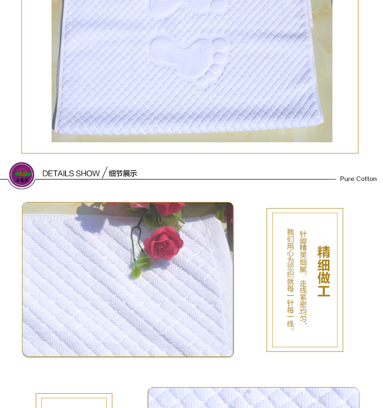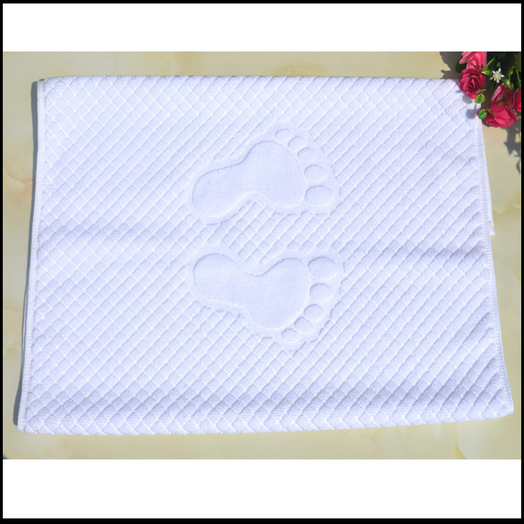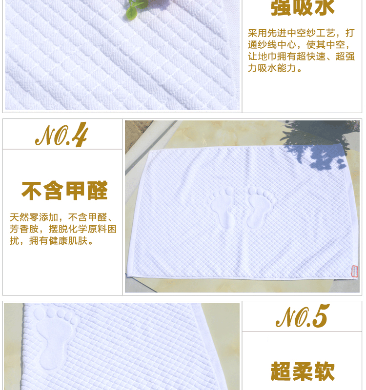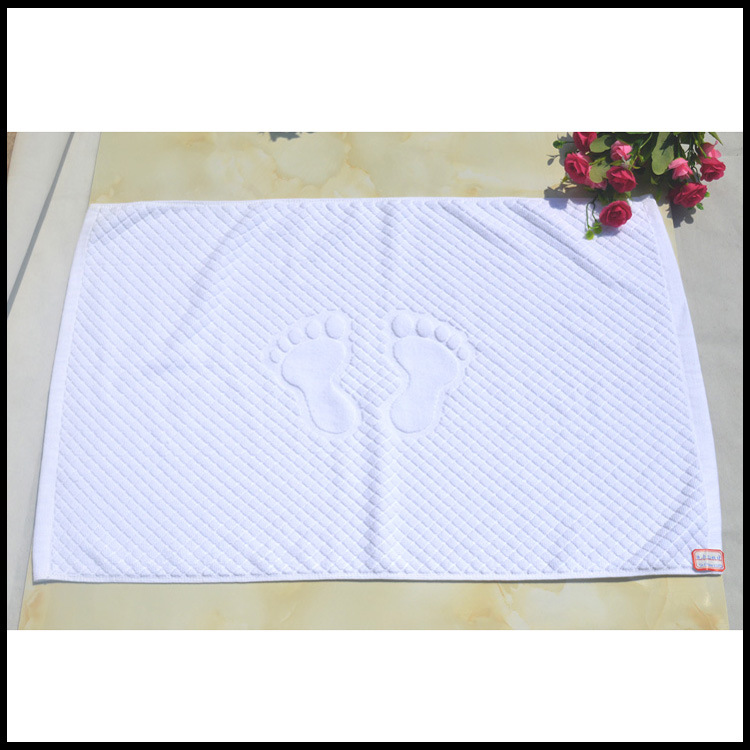 純棉小腳丫提花地巾 酒店賓館客房專用加厚門墊 全棉地墊防滑墊,選取材料為純天然的巴基斯坦棉紗,采用天然的材料與精湛的毛巾制作工藝結(jié)合而成;不加任何有刺激、傷害人體的化學(xué)染劑。綠色環(huán)保、源自天然。優(yōu)質(zhì)的棉紗做出來(lái)的毛巾,不僅舒適柔軟而且具有按摩皮膚和緩解疲勞的生物功效。毛圈平整、均勻,毛巾摸著柔軟、蓬松。聞著無(wú)異味。水洗不會(huì)掉色。