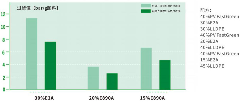 從圖清晰可見E890A 可以在鈦青顏料分散中得到更好的效果。當(dāng)斷料的強(qiáng)度不變,用E890A 作為分散劑測得的過 濾網(wǎng)壓力值是遠(yuǎn)低于E2A 做分散劑的壓力值。此外,EB90A 具有極好的潤滑性和高效性,從而較低的添加量也可得 到較低的過濾網(wǎng)壓力值和較高的著色力。