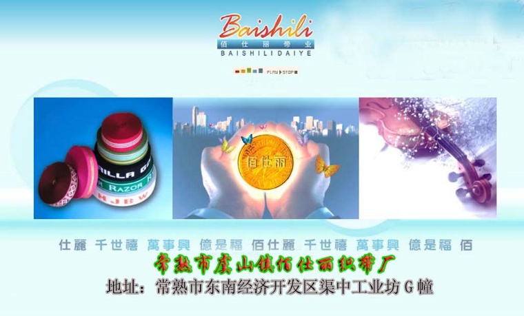 常熟市虞山鎮(zhèn)佰仕麗織帶廠創(chuàng)立于2003年, 是從事窄幅無梭織帶的專業(yè)生產廠家,引進當前最先進無梭織帶設備,廣招高新技術人材,擁有強大的制造和開發(fā)能力,可年生產織帶5000萬米。本廠產品有服裝用各類絳綸織帶、全棉織帶、尼龍裝飾織帶、包邊織帶、滾邊織帶、腰帶、圓繩織帶、松緊織帶;及皮帶、背包、箱包等用途織帶。
