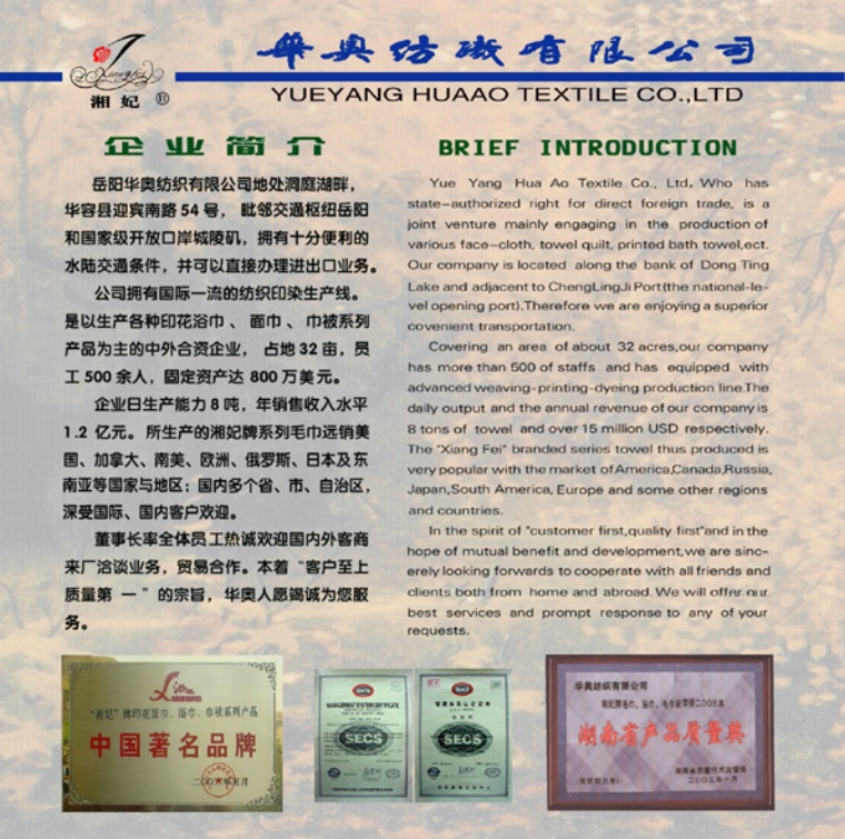 岳陽華奧紡織有限公司是一家生產(chǎn)家用紡織品的中外合資企業(yè),公司擁有三條配套國際先進的全自動電腦磁棒大刮底印花、水洗生產(chǎn)線,企業(yè)總資產(chǎn)達8000萬元,主要產(chǎn)品為:各種不同規(guī)格的大刮底印花(素色)面巾、浴巾、毛巾被等產(chǎn)品,享有自營出口和海關(guān)自理報關(guān)權(quán)。