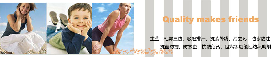 公司創(chuàng)建于2005年,自成立以來一直專業(yè)致力于高檔紡織品印染后功能性整理助劑的代理經(jīng)銷,我們銷售的有美國杜邦、美國3M公司、科萊恩、亨斯邁(原瑞士汽巴精化)公司、日本大金公司、明成化學(xué)工業(yè)株式會社、魯?shù)婪颉退狗虻葞资畟€國際著名品牌。產(chǎn)品囊括了防靜電功能、免燙功能、耐久阻燃功能、超強(qiáng)抗紫外線UV功能、高效抗菌防臭功能、吸濕排汗功能、納米NANO三防(防水防油防污)功能,防塵功能、易去污功能、芳香功能、遠(yuǎn)紅外線保暖保健功能、負(fù)離子光觸媒功能、防電子輻射功能等所有后功能性整理劑。公司擁有一批專業(yè)化、國際化、高素質(zhì)的研發(fā)、銷售服務(wù)人員,并得到了中國紡織大學(xué)、紡織學(xué)院等高等學(xué)府的大力支持,技術(shù)力量雄厚。